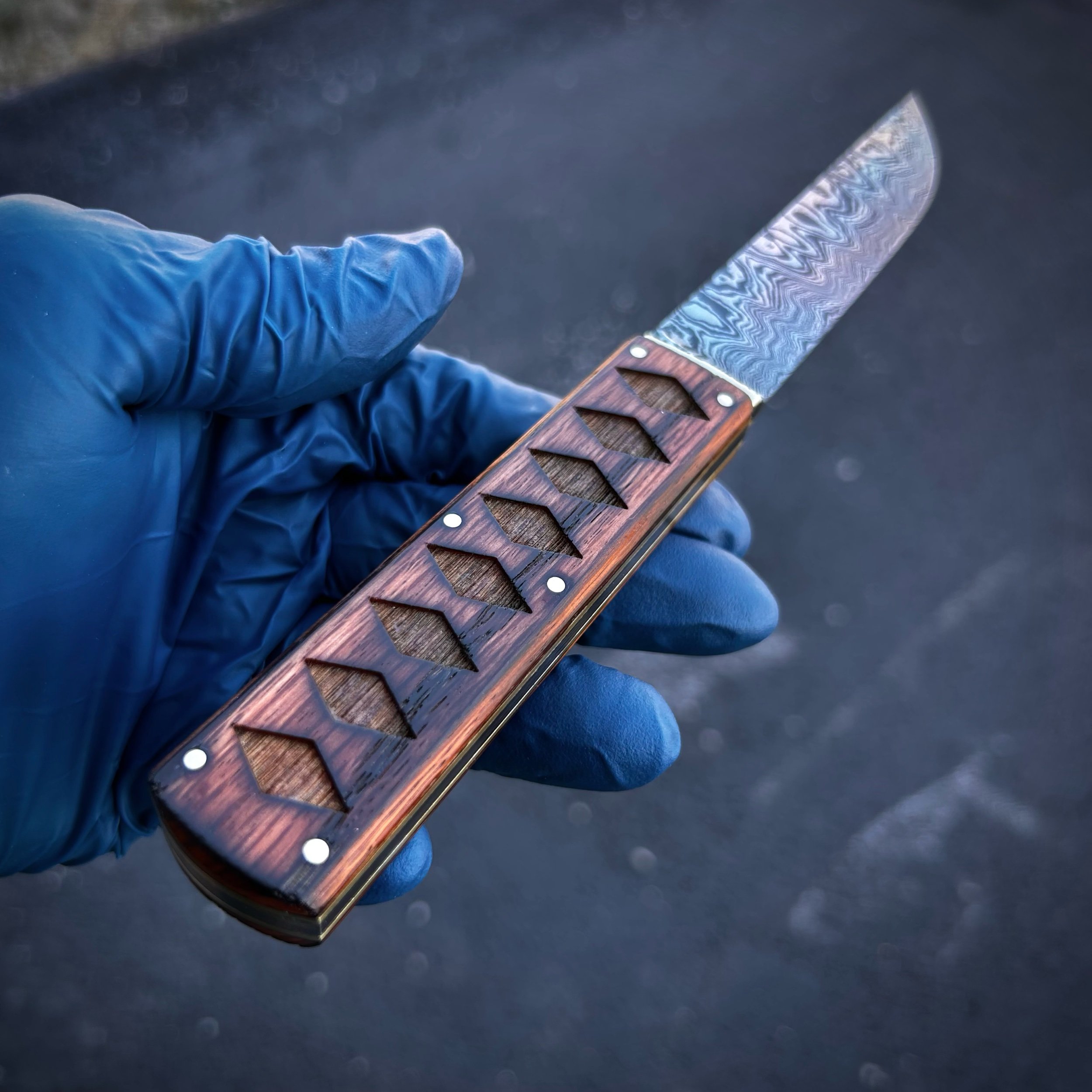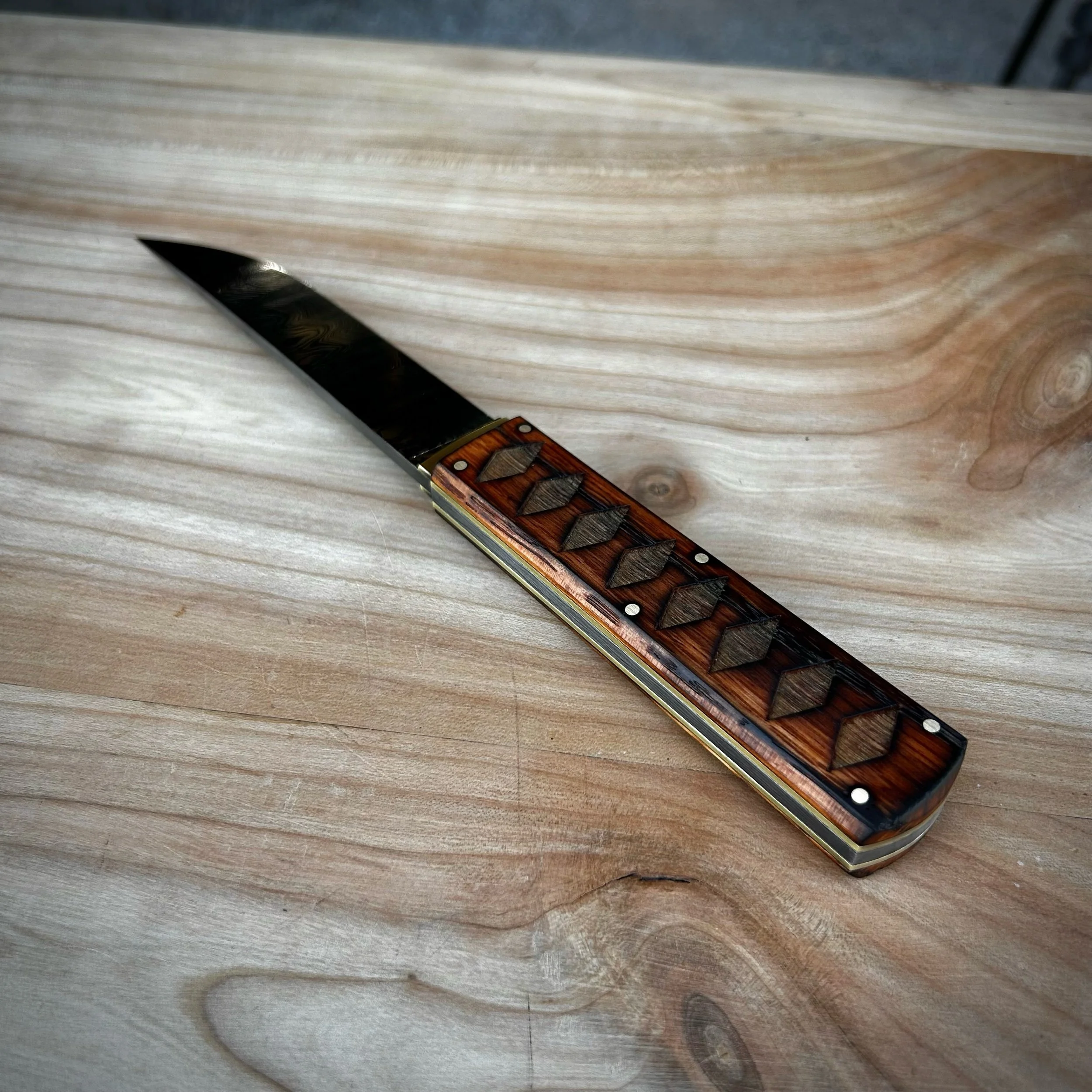 The oak handle scales were engraved with diamonds to resemble the repeating diamonds of a traditional Ito wrap, and to provide an extremely secure grip. The scales have been burnt and treated to protect from the elements and to give a more organic and textured look/feel. The blasted and antiqued brass liners are carefully sculpted to protrude from the handle scales and appear as a habaki.