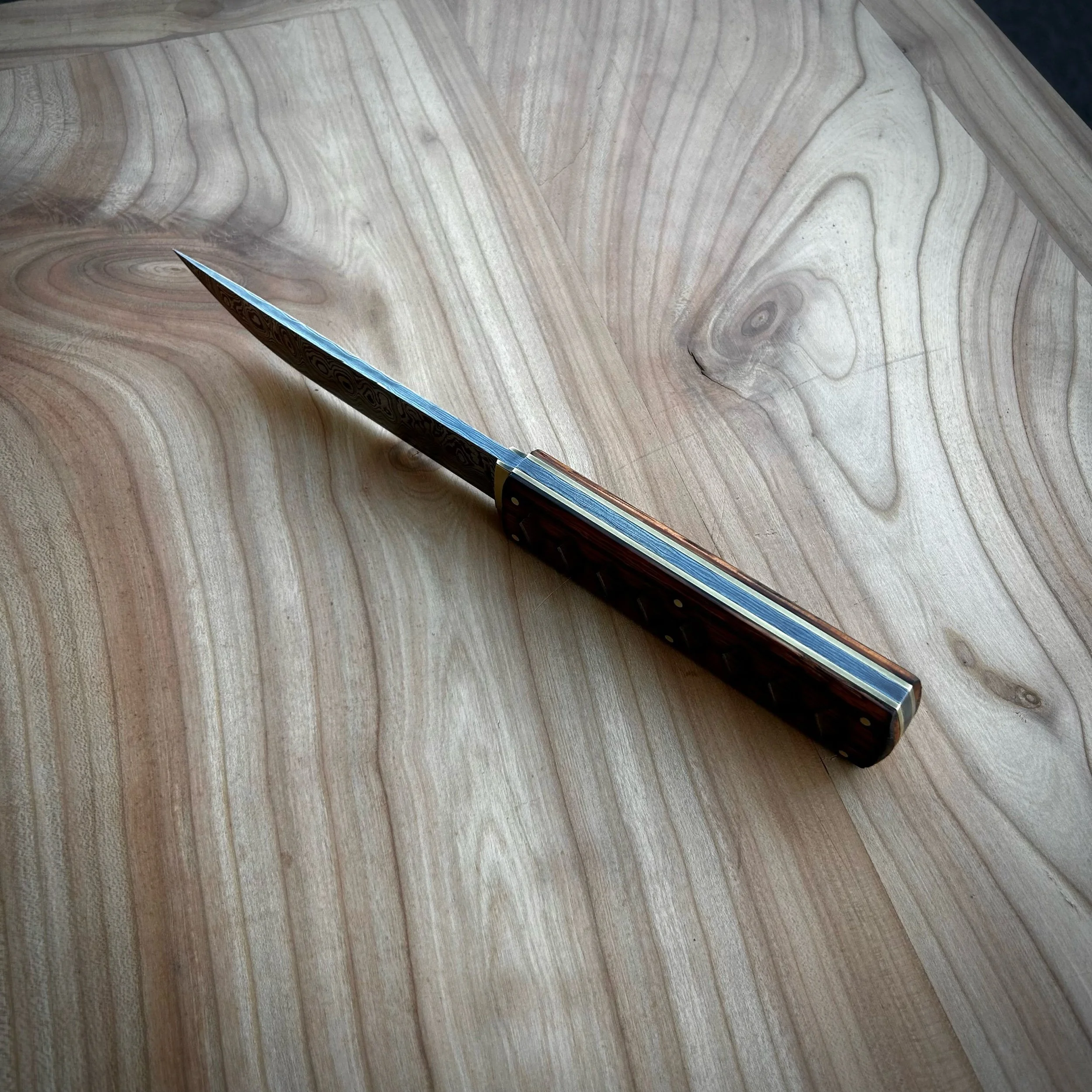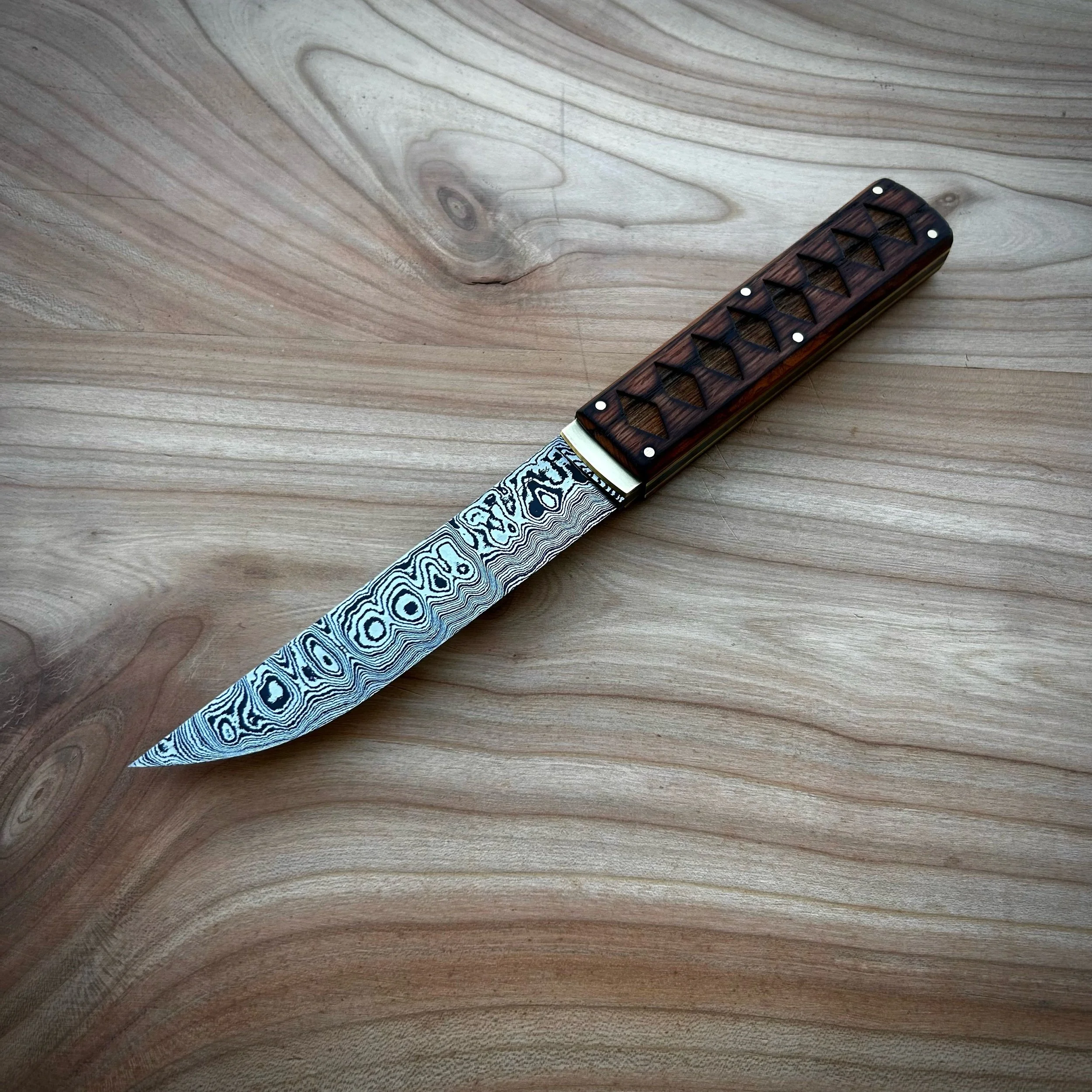 I designed this modified Japanese tanto to bring the strength and feel of a full-tang blade while paying homage to some of the classic Japanese tanto features such as the habaki and ito wrap. From the side, it closely resembles a hidden-tang or frame-tang knife, however it is one seamless piece with permanently affixed handle scales.