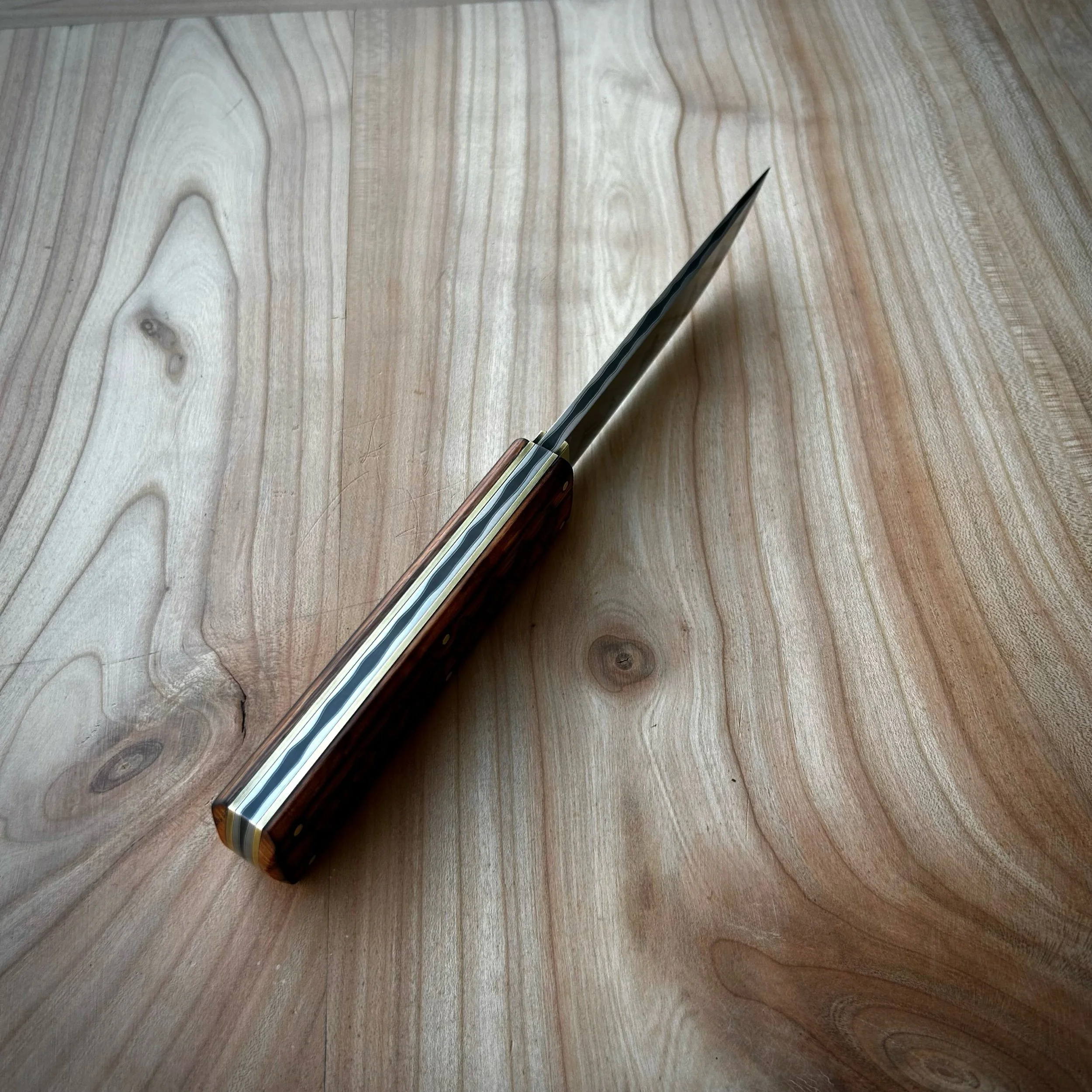 I designed this modified Japanese tanto to bring the strength and feel of a full-tang blade while paying homage to some of the classic Japanese tanto features such as the habaki and ito wrap. From the side, it closely resembles a hidden-tang or frame-tang knife, however it is one seamless piece with permanently affixed handle scales.