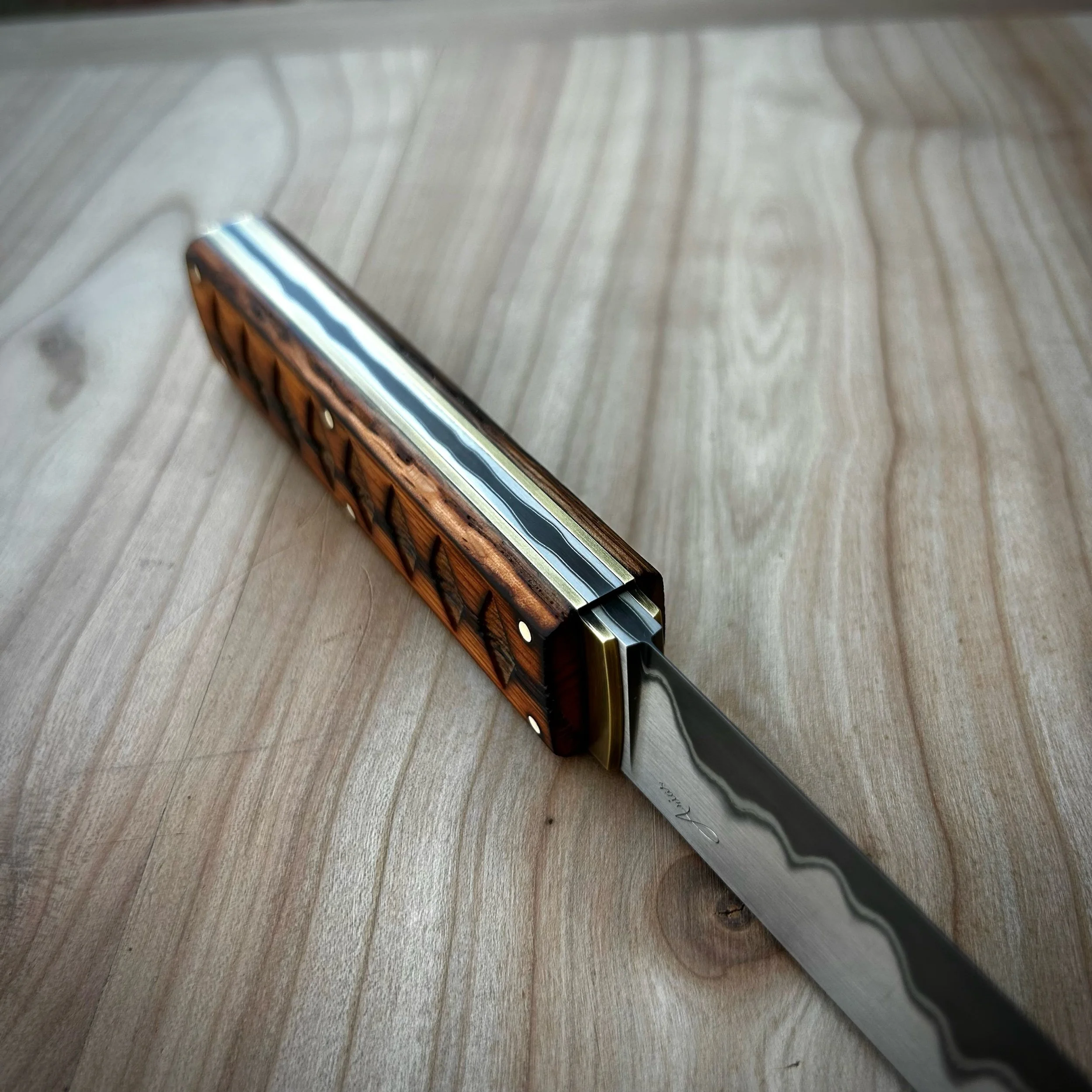 The oak handle scales were engraved with diamonds to resemble the repeating diamonds of a traditional Ito wrap, and to provide an extremely secure grip. The scales have been burnt and treated to protect from the elements and to give a more organic and textured look/feel. The blasted and antiqued brass liners are carefully sculpted to protrude from the handle scales and appear as a habaki.
