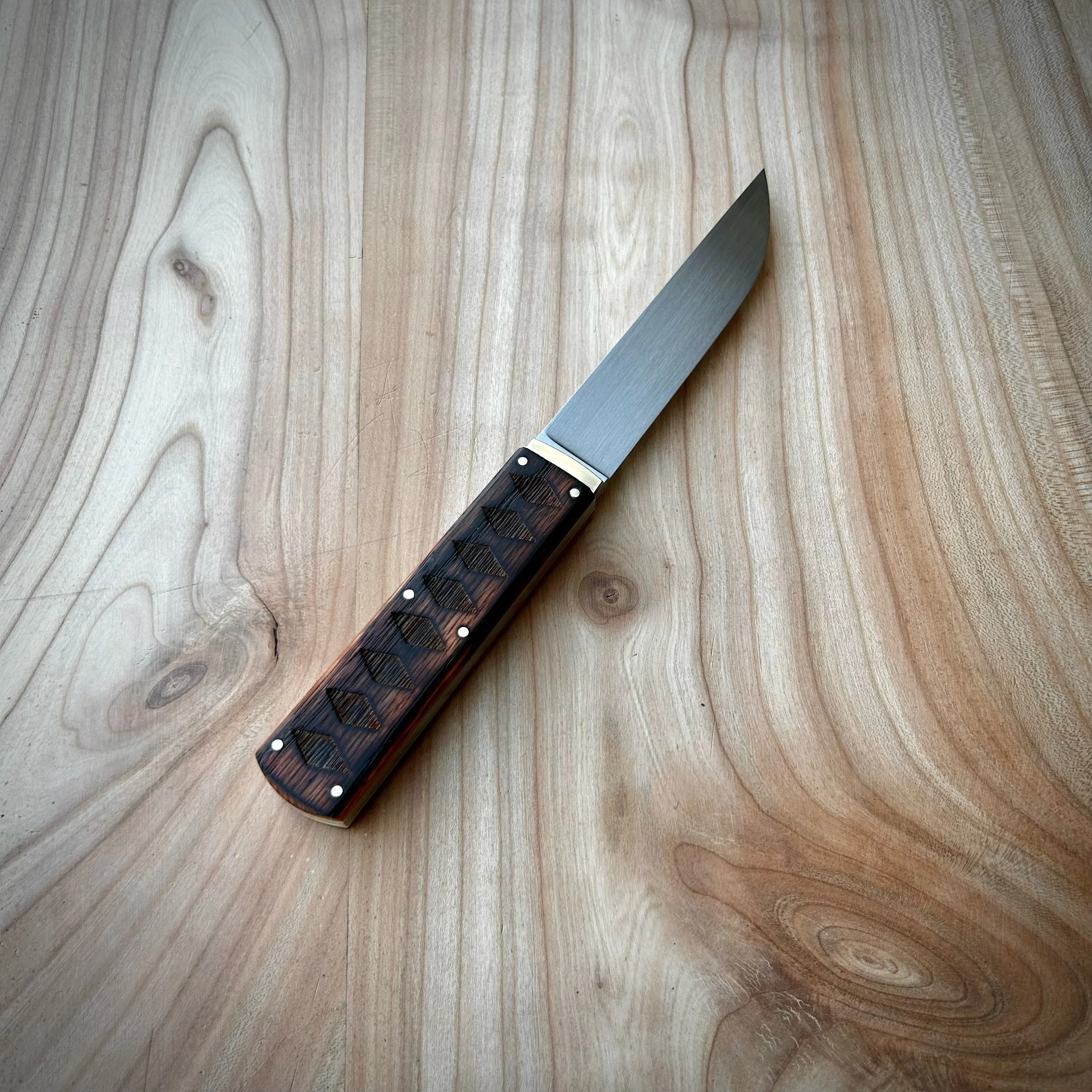 The oak handle scales were engraved with diamonds to resemble the repeating diamonds of a traditional Ito wrap, and to provide an extremely secure grip. The scales have been burnt and treated to protect from the elements and to give a more organic and textured look/feel. The blasted and antiqued brass liners are carefully sculpted to protrude from the handle scales and appear as a habaki.