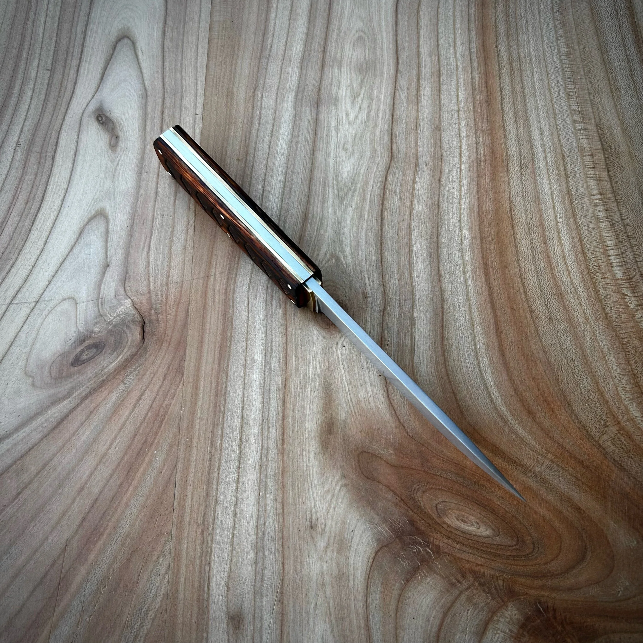I designed this modified Japanese tanto to bring the strength and feel of a full-tang blade while paying homage to some of the classic Japanese tanto features such as the habaki and ito wrap. From the side, it closely resembles a hidden-tang or frame-tang knife, however it is one seamless piece with permanently affixed handle scales.